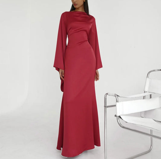 Solid Color Off-the-Shoulder Asymmetric Statement Sleeve Elegant Abaya Maxi Dress for Women-Red