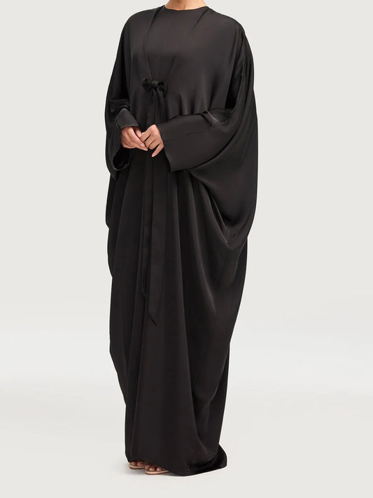 Tie Bow Big Ruffles Satin Kaftan - Night Black