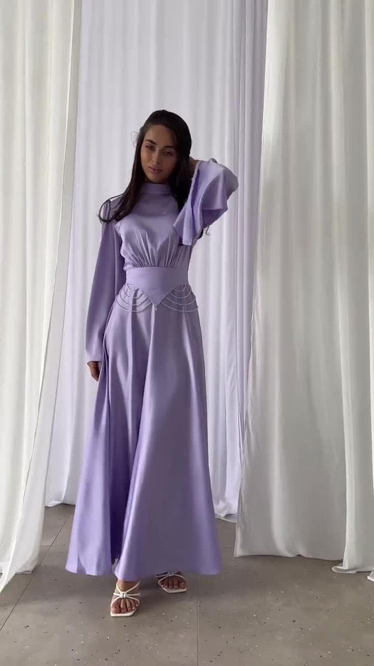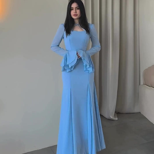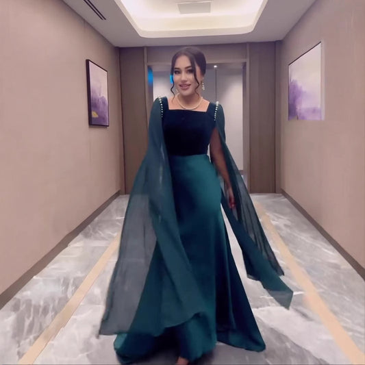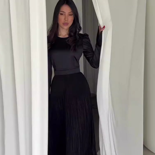 Patchwork Long Satin Slim Dress with Large Swing Sleeves
