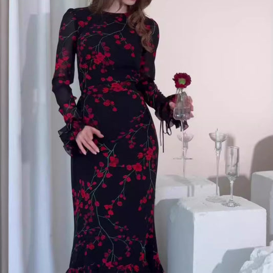 Women's Long-sleeved Slim Ruffled A-line Dress