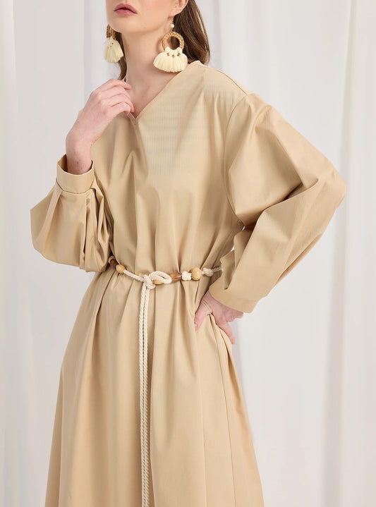 Modest Muslim Casual Waist-Tie Maxi Abaya Dress-Light Brown