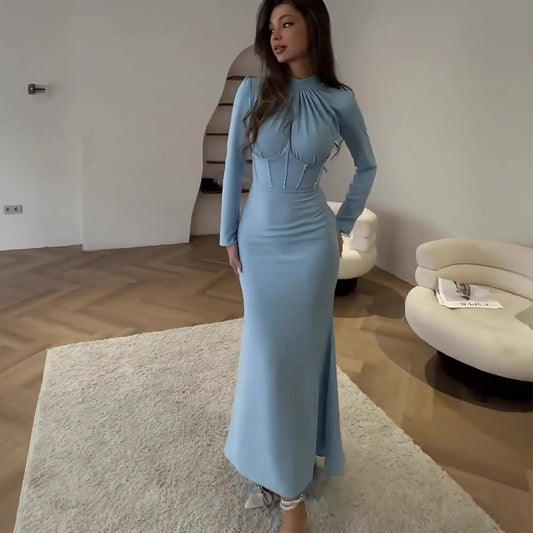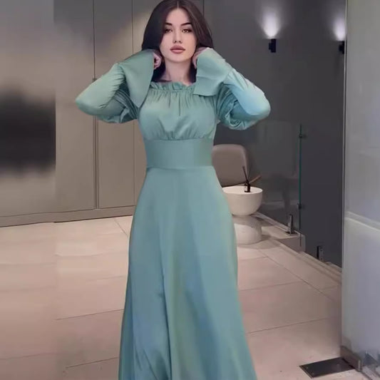 Women's Waist-cinching Solid Color Long-sleeved Dress
