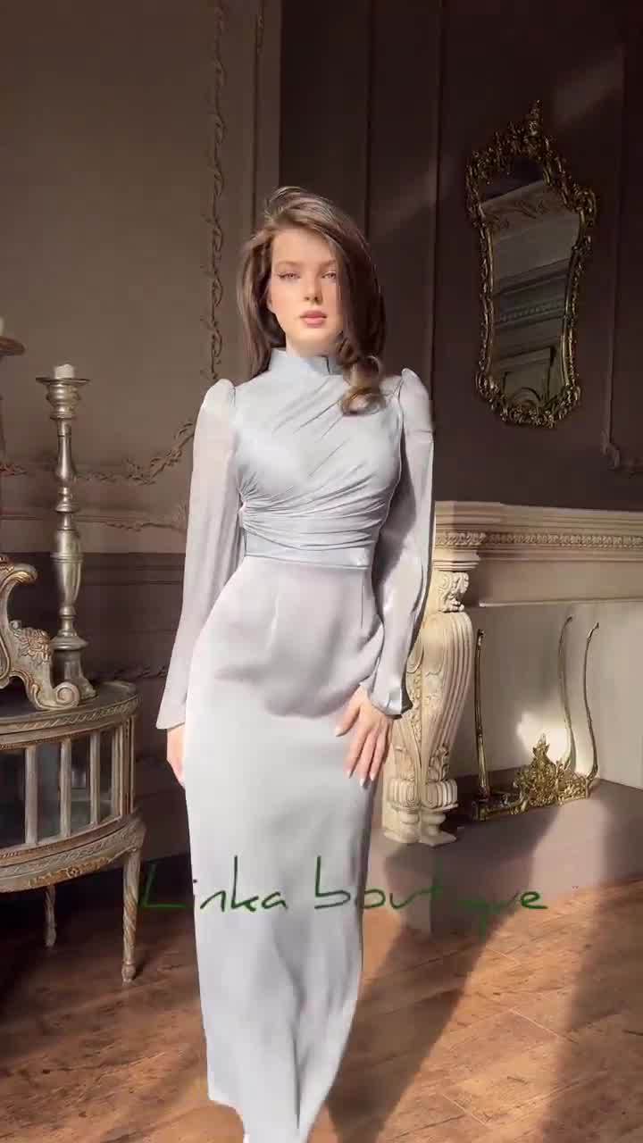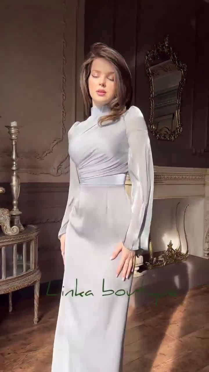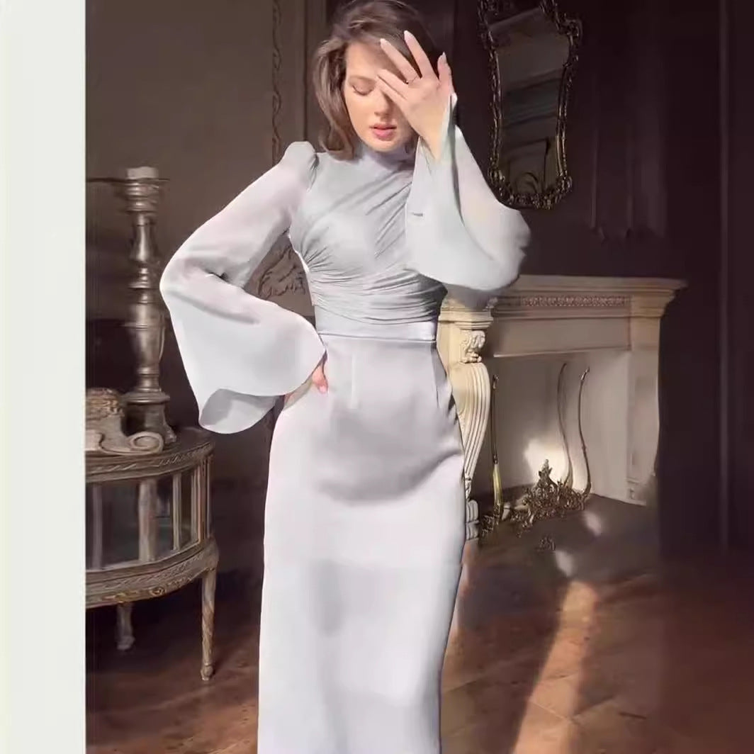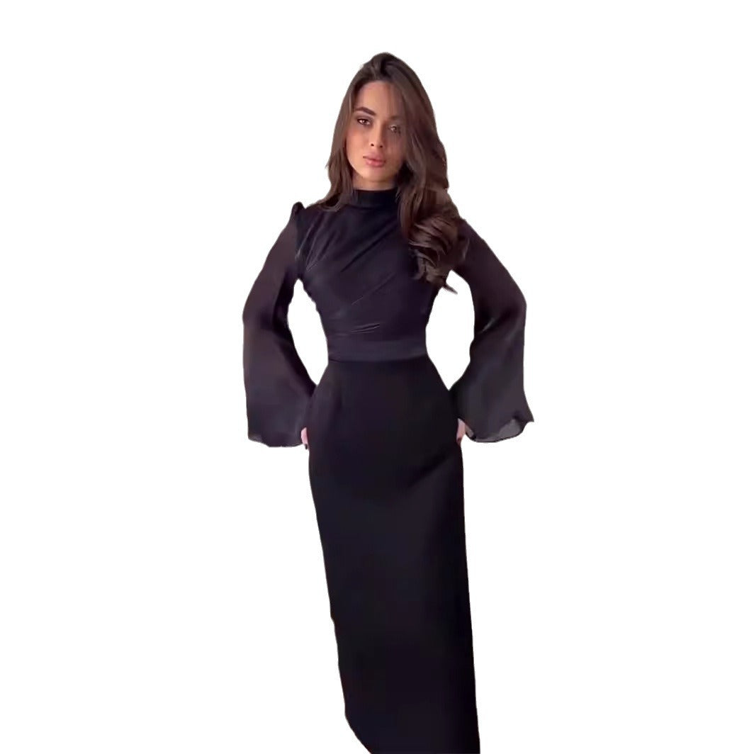 Half-high Neck Flared Sleeve Waist-cinching Hip Dress