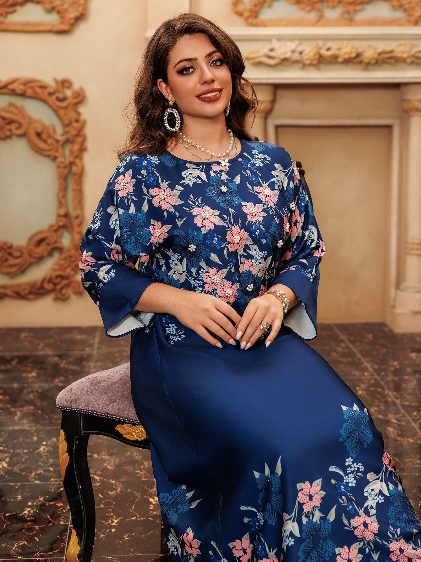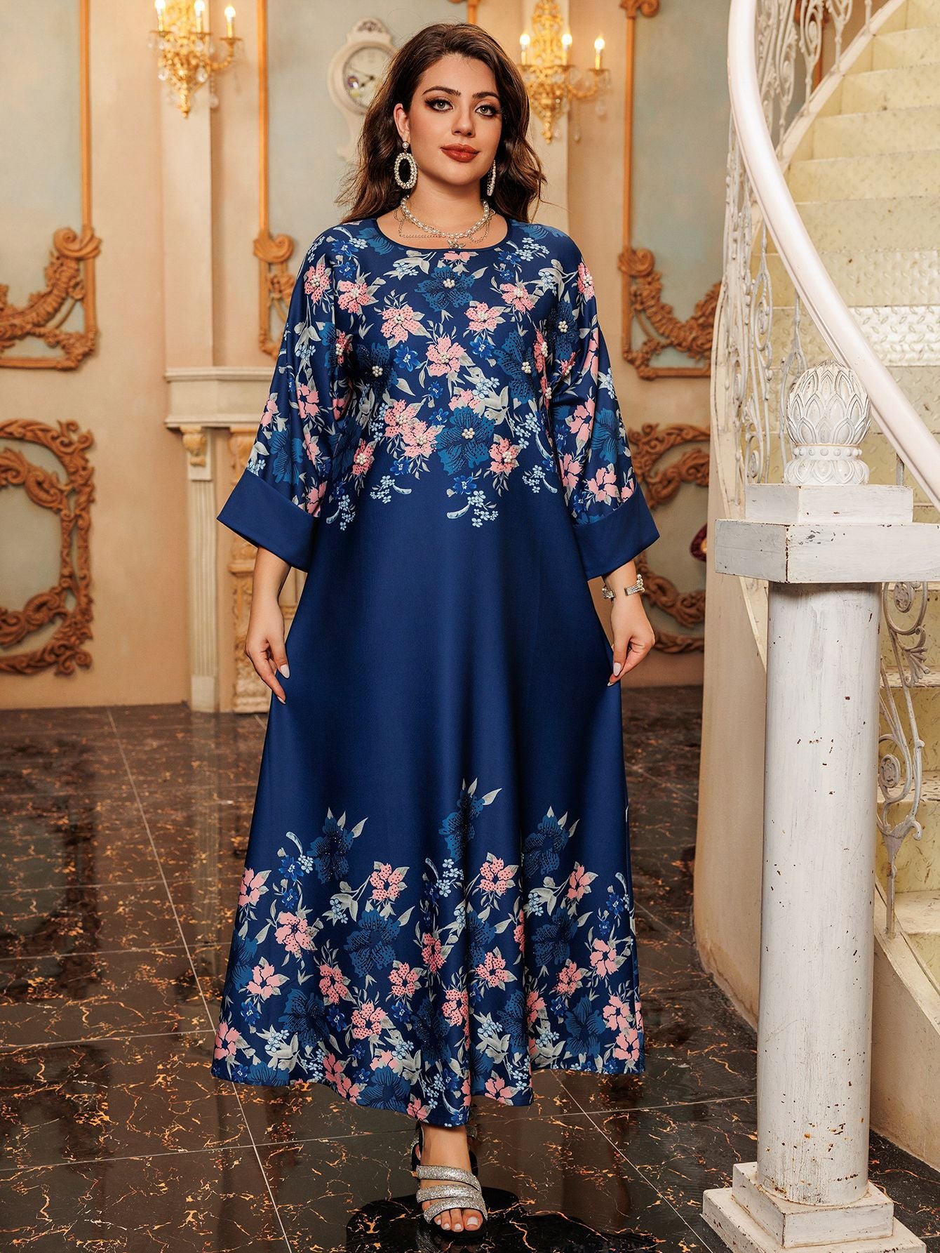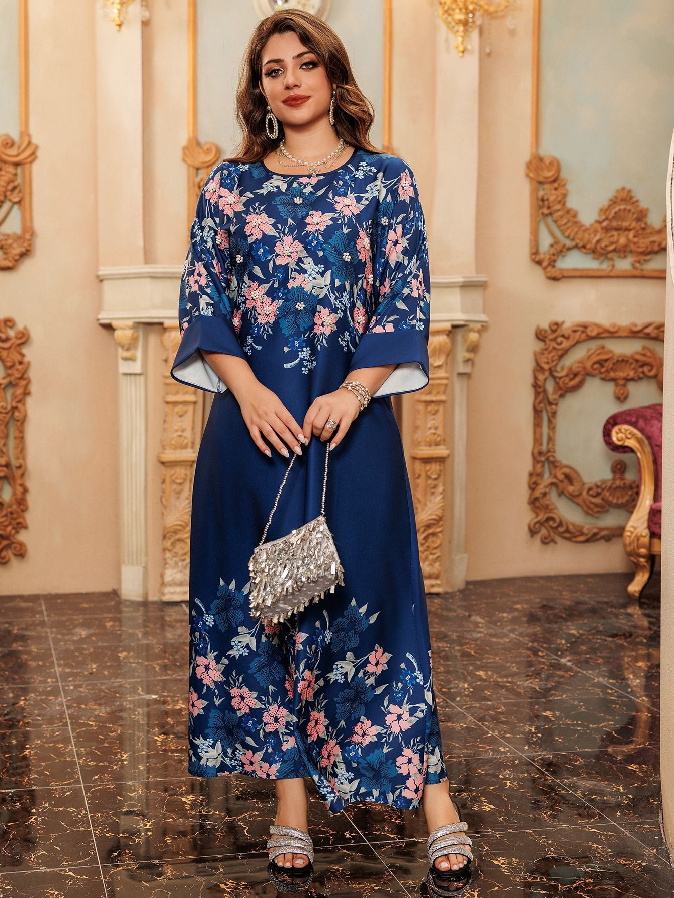 Luxury Floral Pearls Maxi Dress - Blue