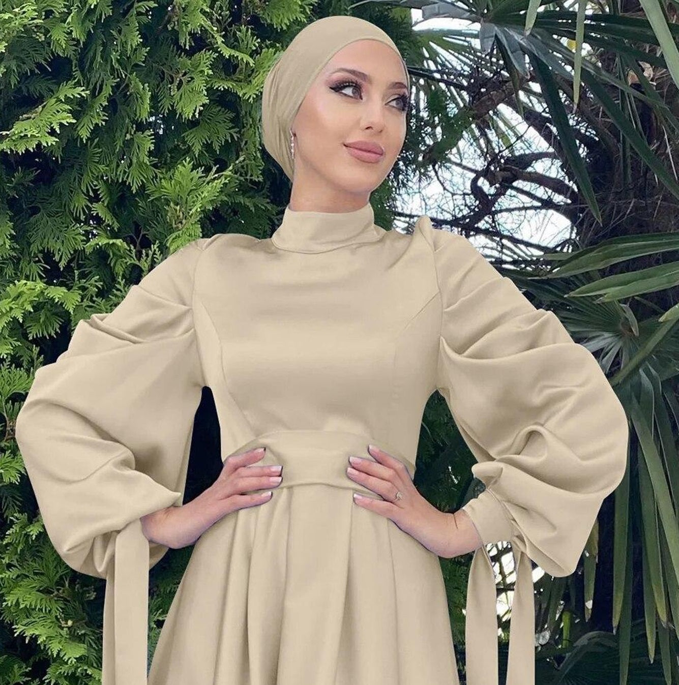 Modest Plain Satin Stripes Sleeve Abaya Dress - Apricot
