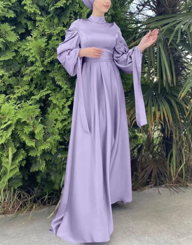 Modest Plain Satin Stripes Sleeve Abaya Dress - Purple