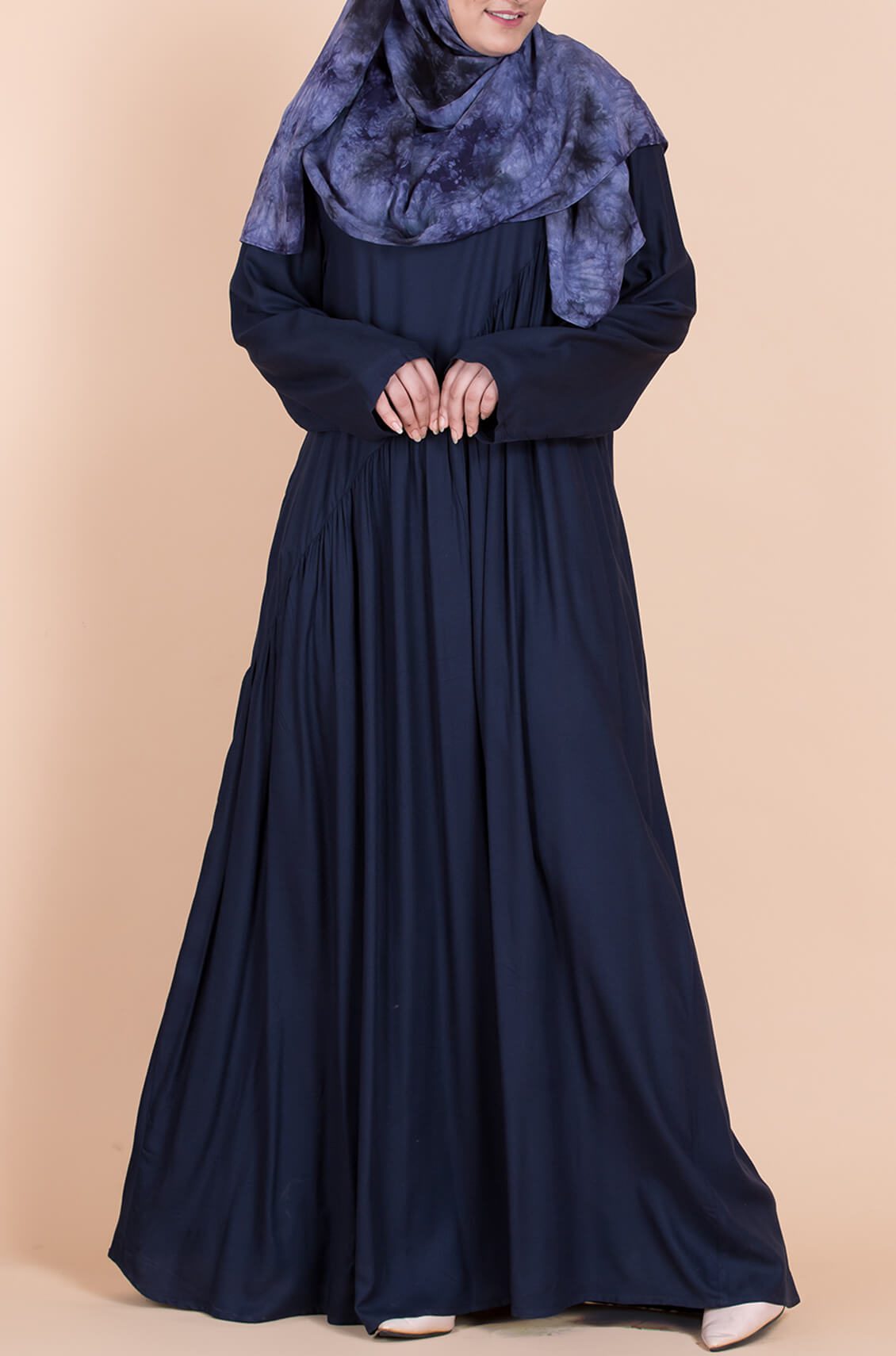 Navy Blue Asymmetric Smocked Round-neck Dress