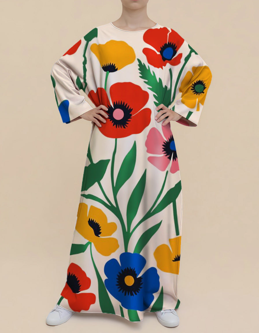 This kaftan blends plus‑size ease, modest coverage and a fresh garden print—no layering, no fuss, just grab & go comfort with pockets.