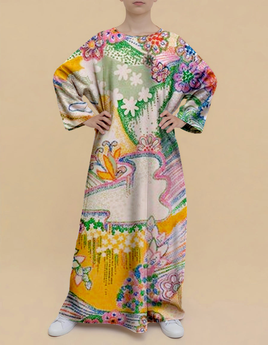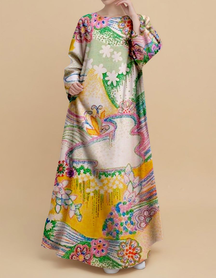 This dress features a crayon - drawing texture, with colorful mountains and flowers. The loose robe holds a childlike artistic sense. For daily outings or vacations, it easily wears romance and vitality.