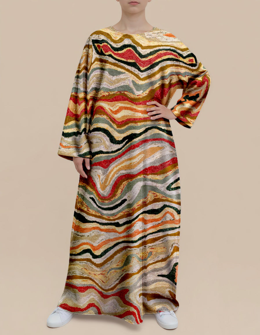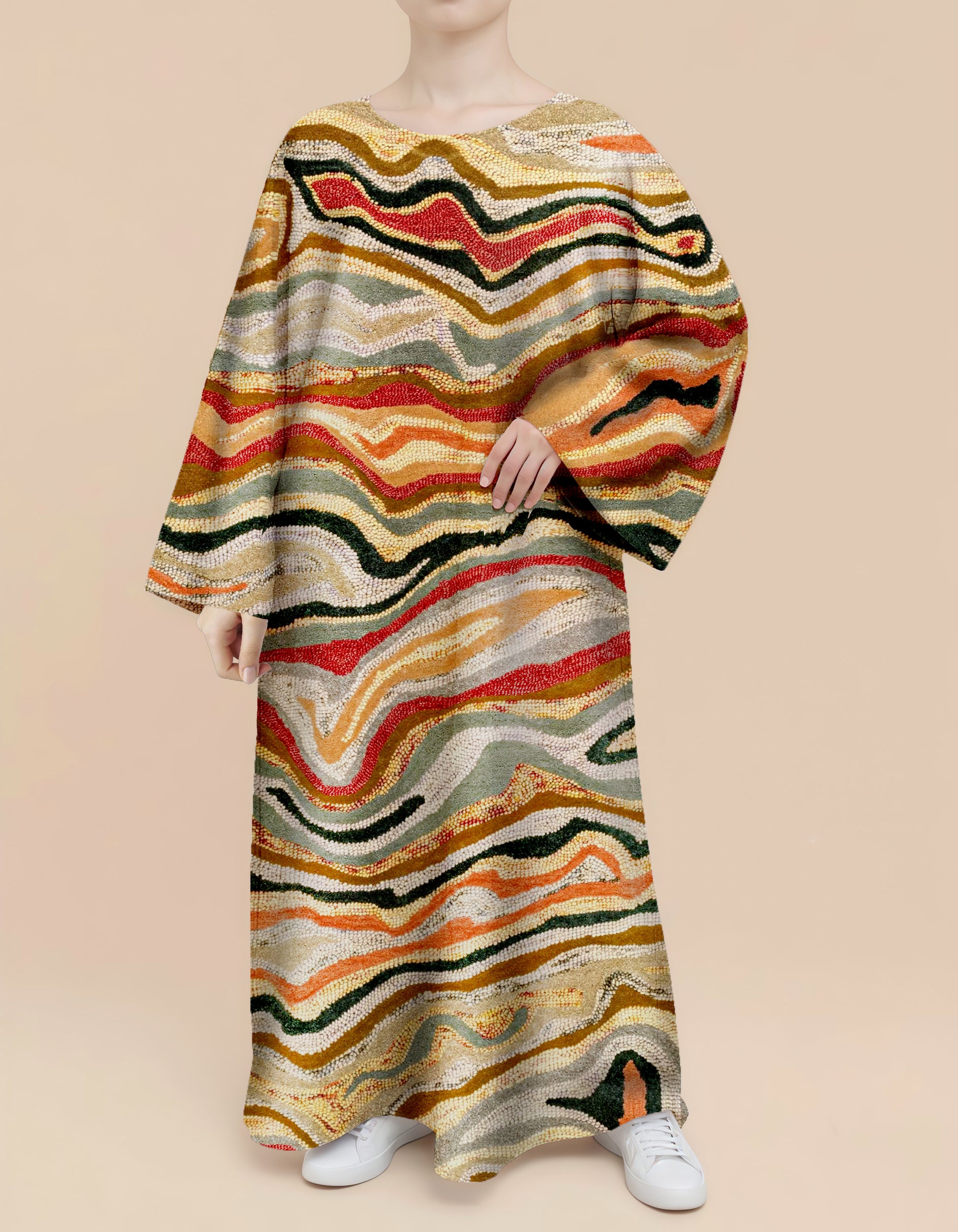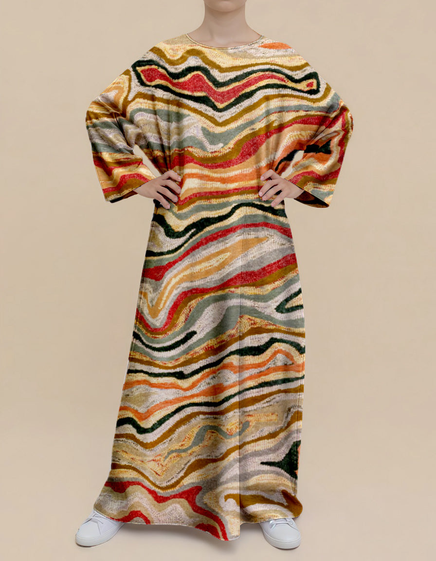 This dress features earth strata. It is rich in colors and has a sense of fluidity. The loose robe - like fit flatters various body shapes. For daily wear, it fully showcases a casual artistic atmosphere, being both fashionable and unique.