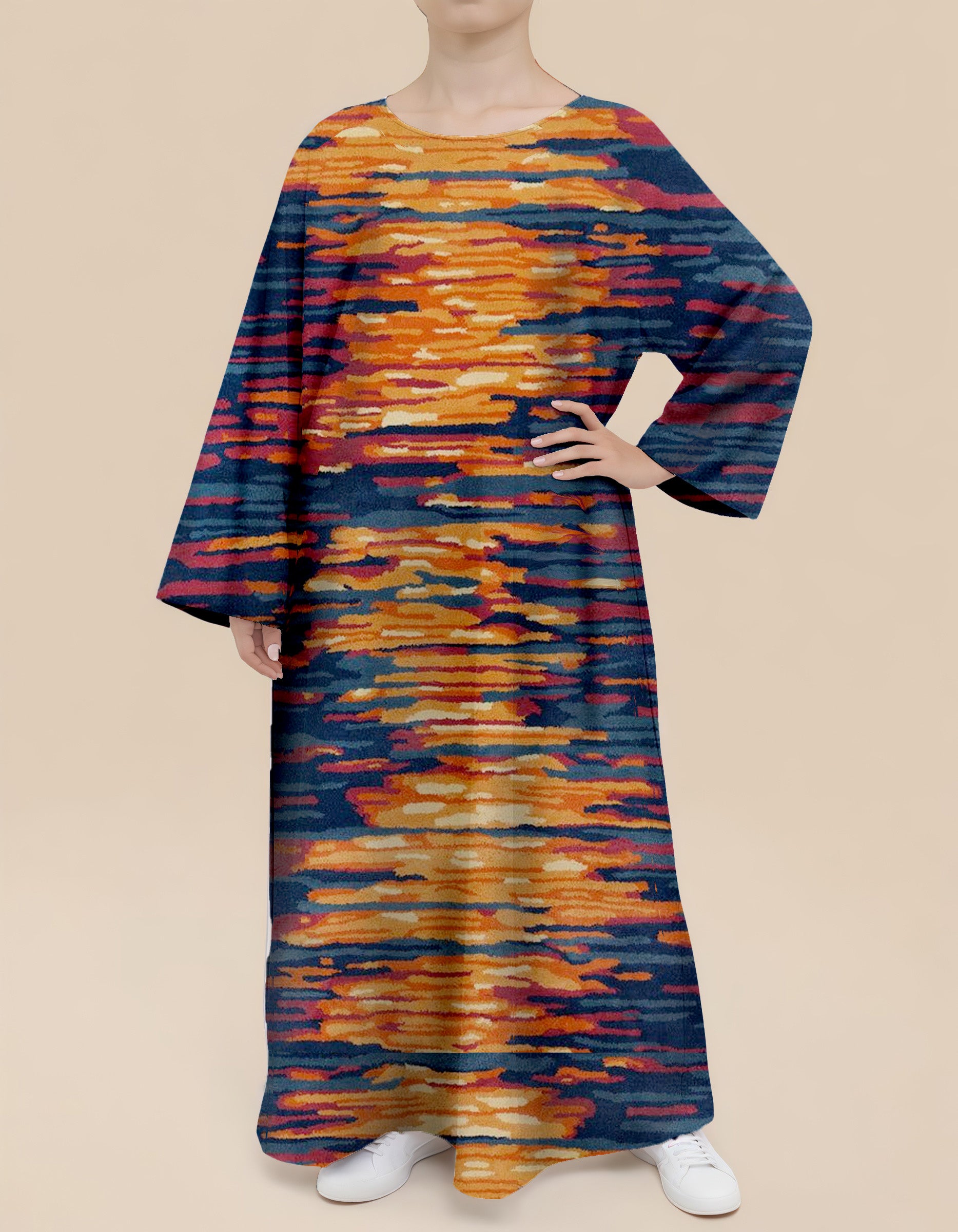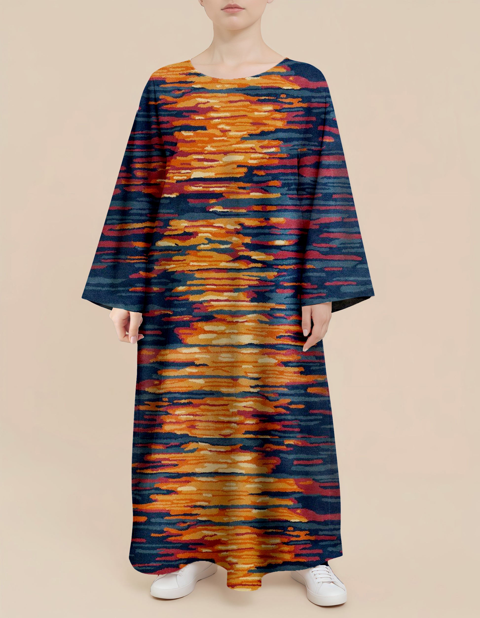 The design of this dress features the sunset reflected on the sea. With a loose kaftan - like silhouette, the colors flow like the afterglow. It turns romantic scenery into walking fashion, suitable for daily wear and vacations.