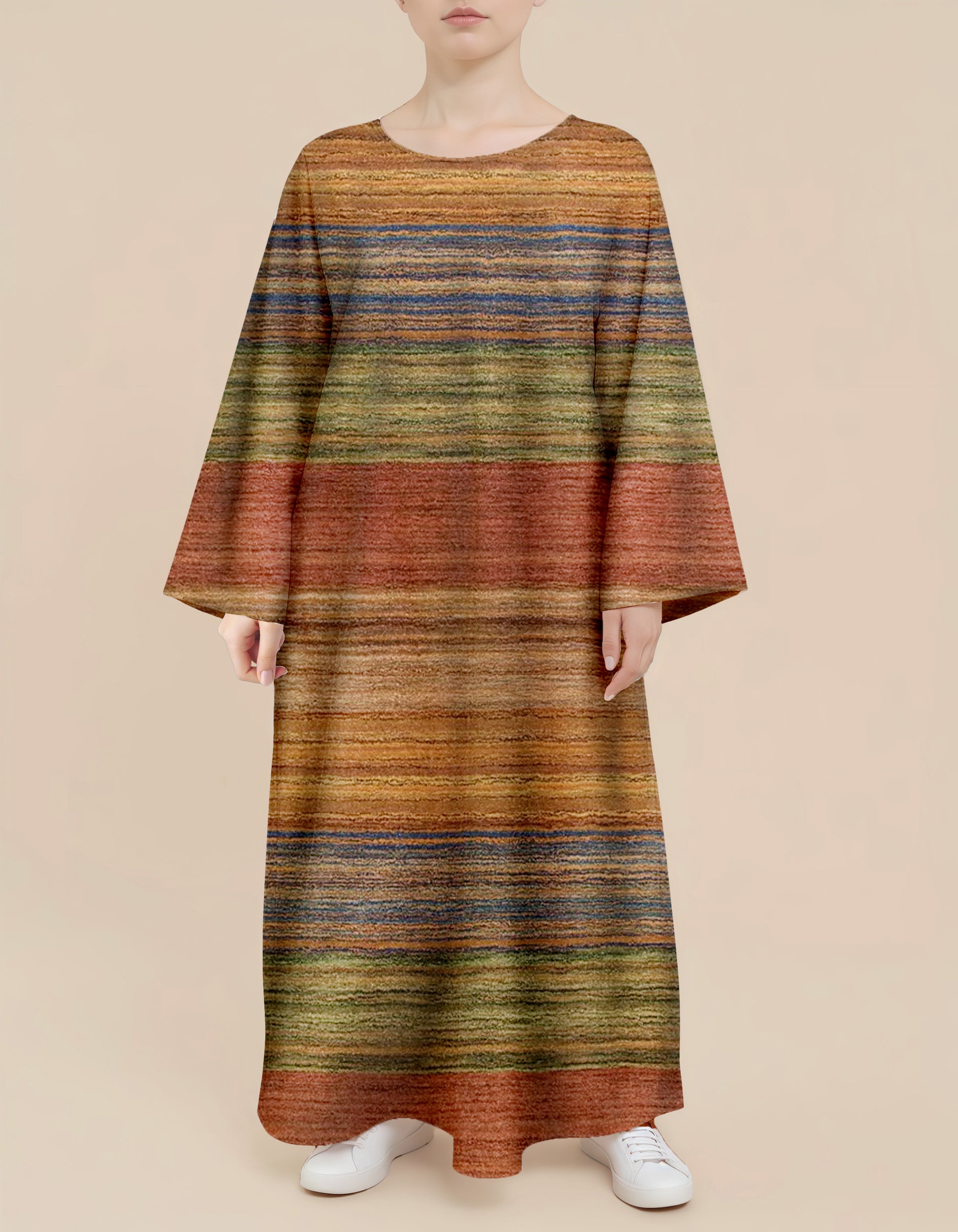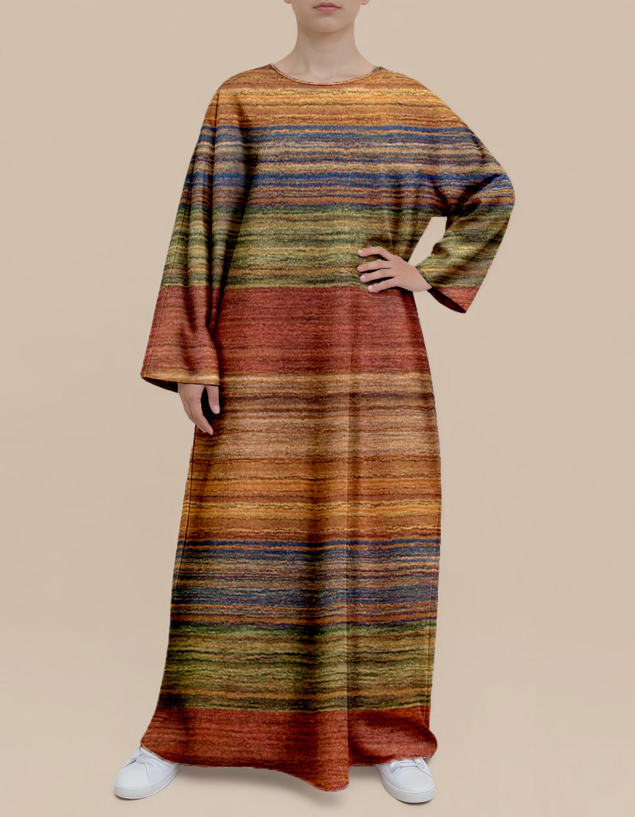 This dress features textured earth - tone stripes as patterns. The colors are derived from nature, and the loose fit ensures comfort and a casual vibe. Whether strolling in the urban streets or going on a vacation far away, it can easily showcase a unique taste and natural charm.