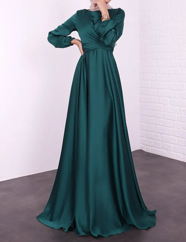Satin Abaya Crossed Belted Evening Dress - Moss Green