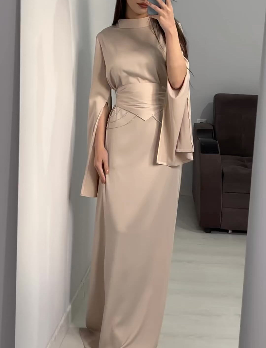 Satin Diamante Chain Waistband Sleeve Split Maxi Dresses