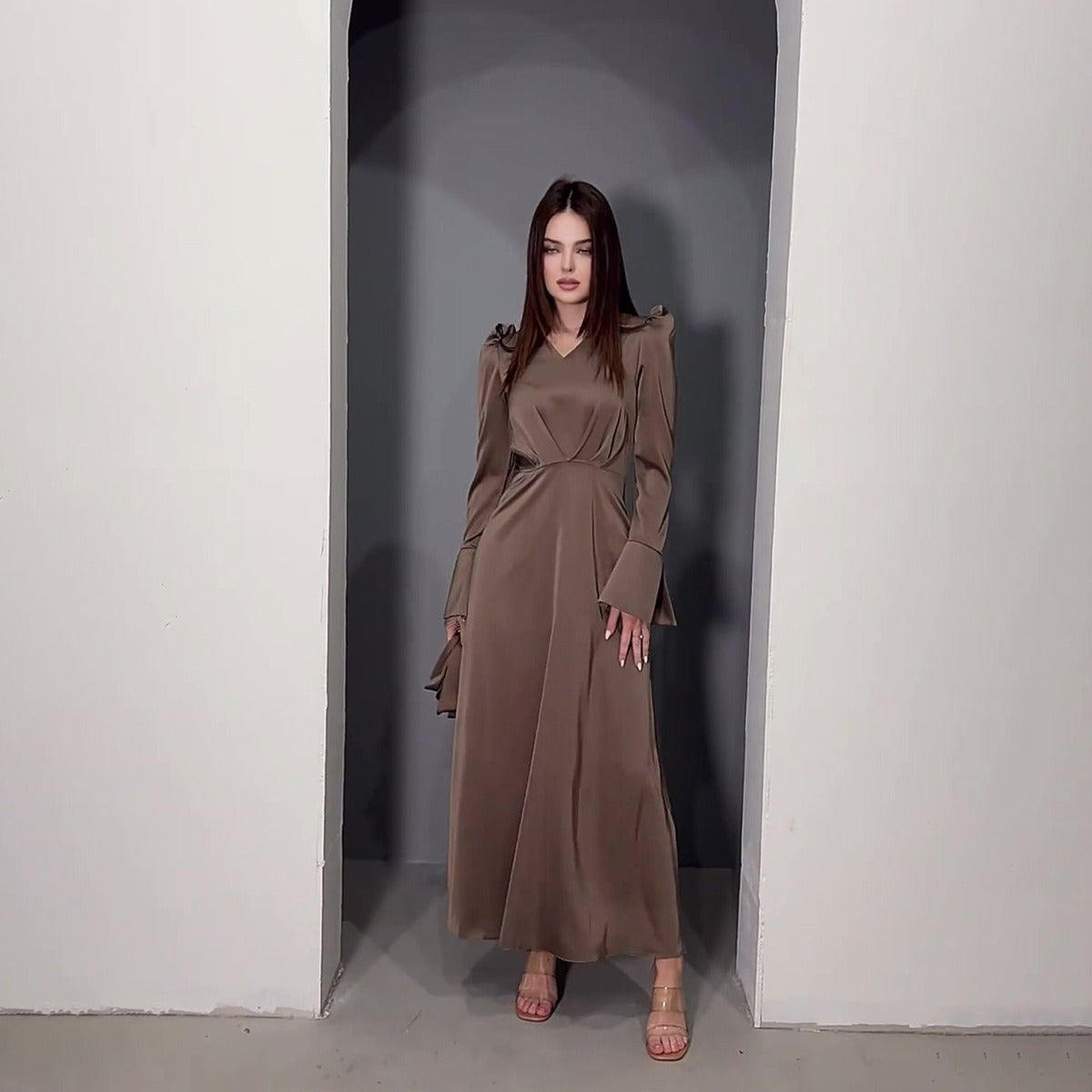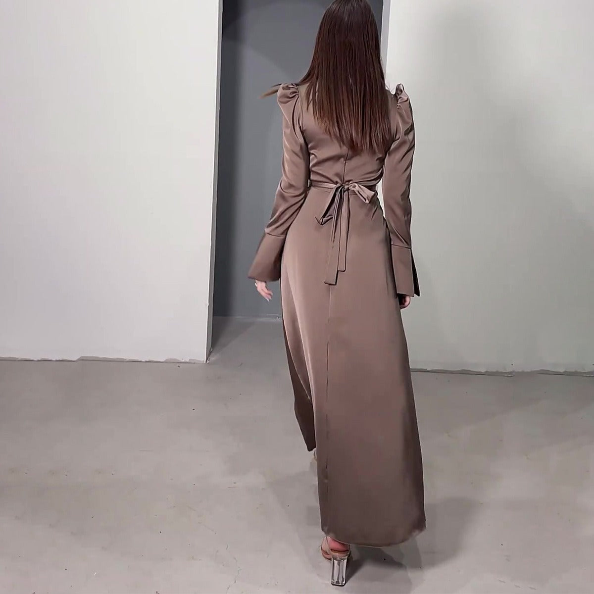 V-neck Long Lace-up Waist Long-sleeved Dress